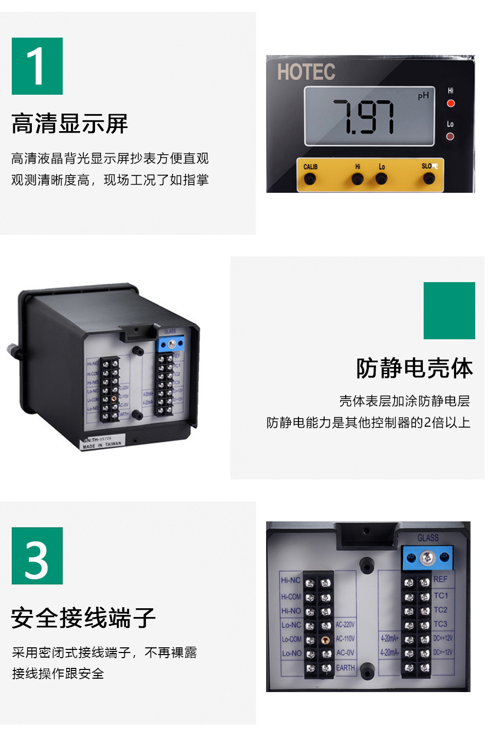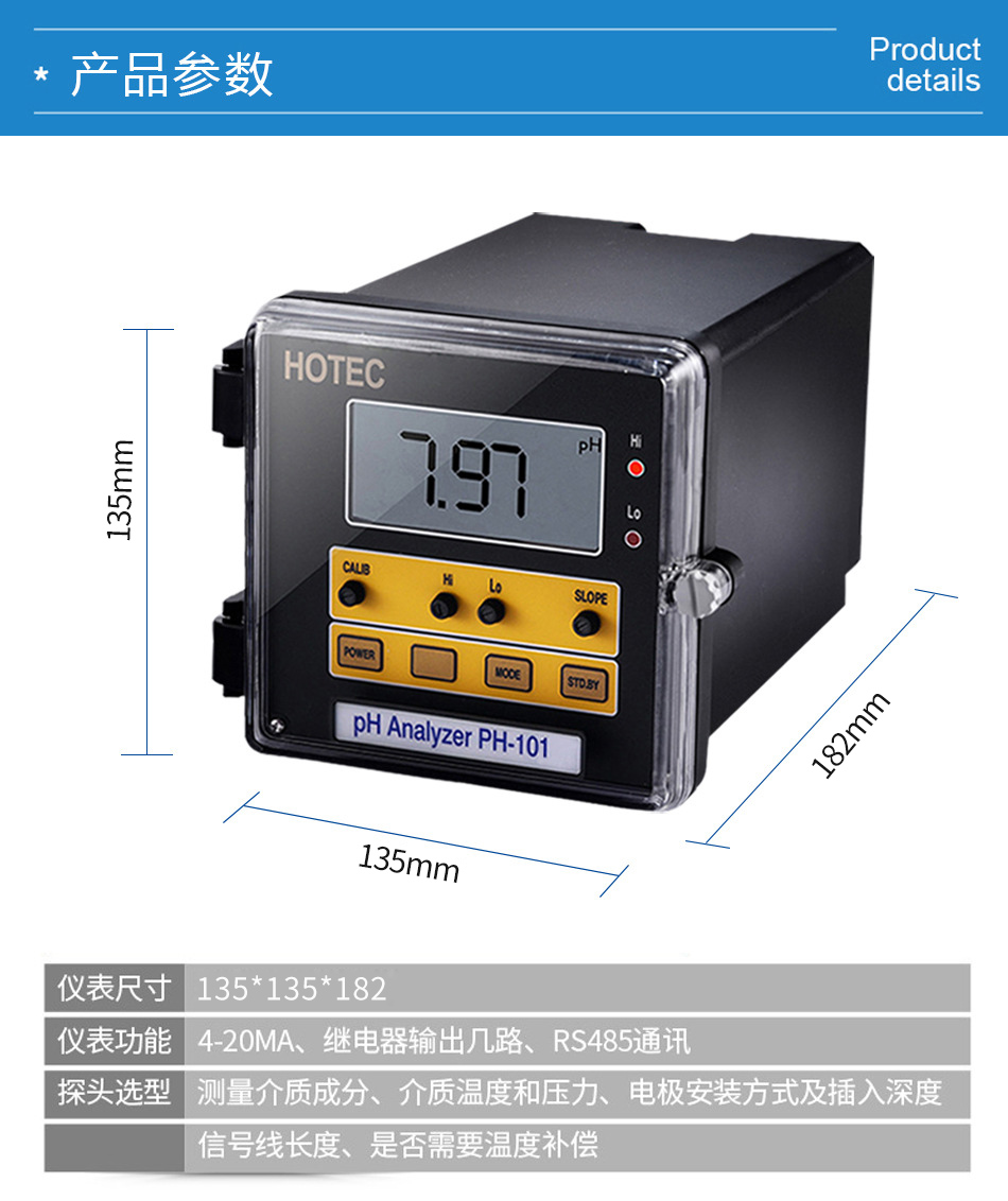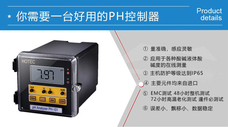 HOTEC PH仪表,合泰PH-101控制仪特殊外壳设计,防水效果佳,具STDBY功能,方便保养及校正,超大型液晶(LCD),耐温至90℃不变黑,4-20mA隔离输出,不易受干扰。