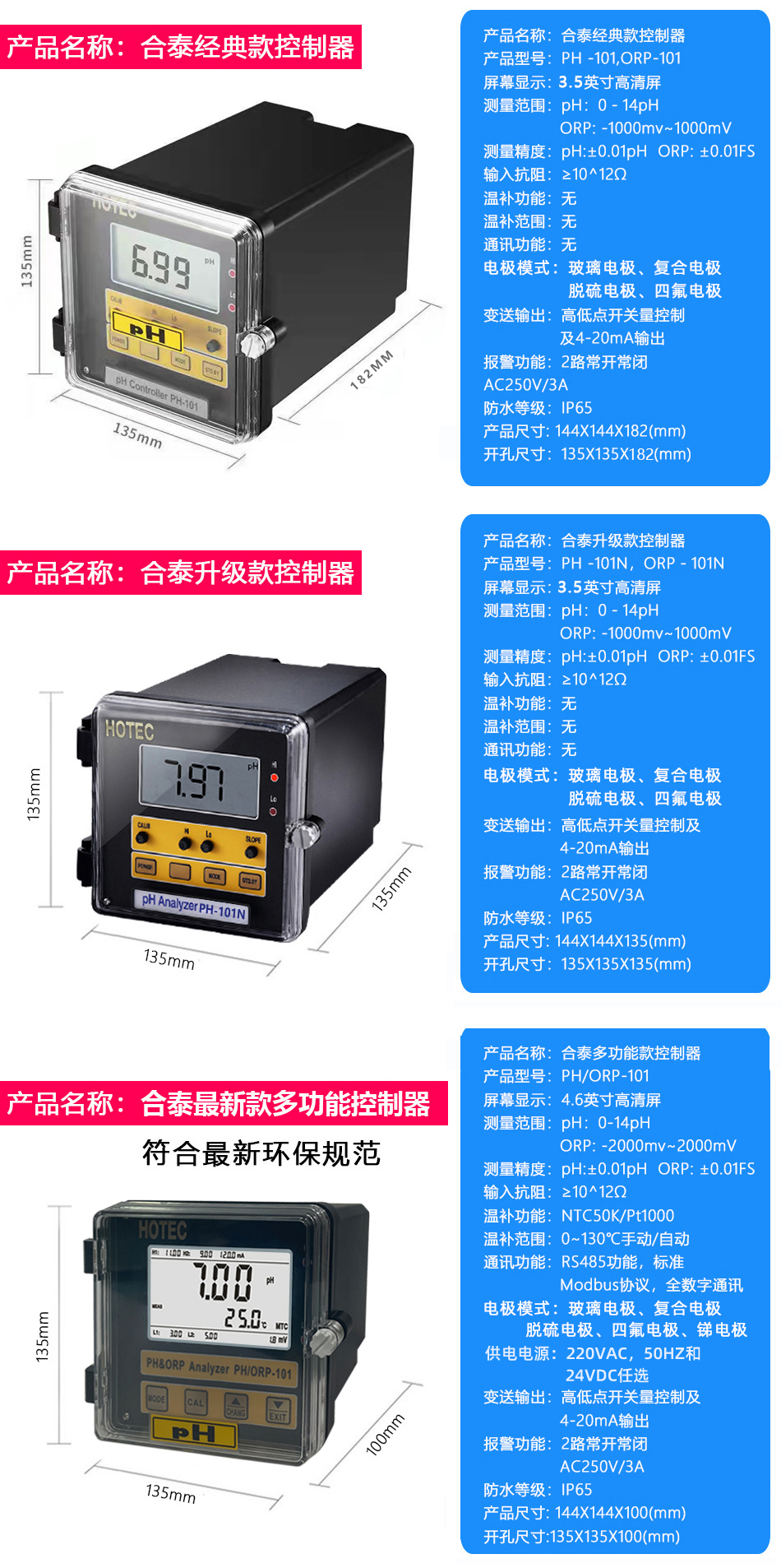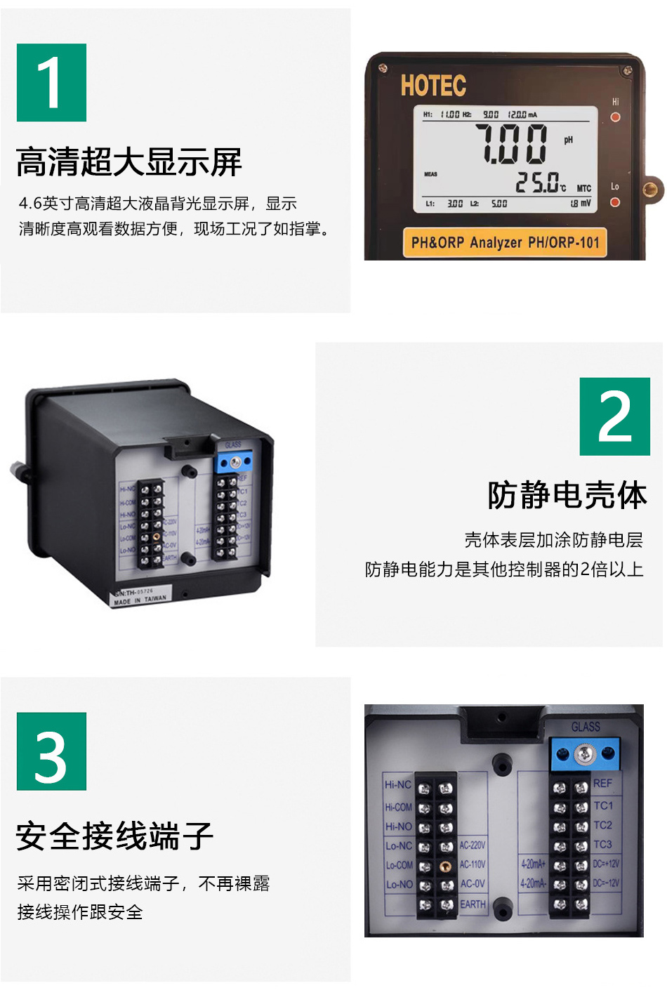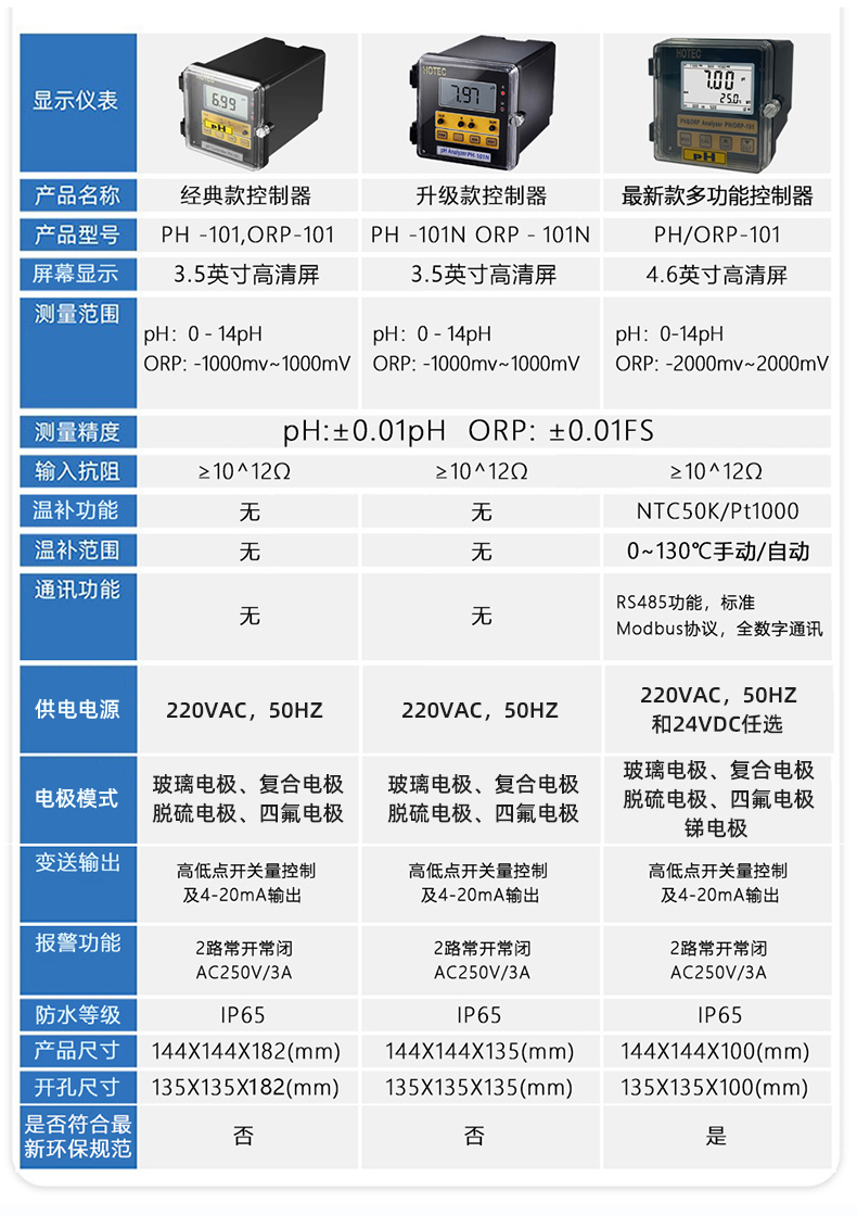4.6英寸超大液晶屏显示,PH/ORP两用功能,带RS-485通讯、温度补偿及显示,适合特殊恶劣环境、现场制程、废水处理及酦酵槽使用。