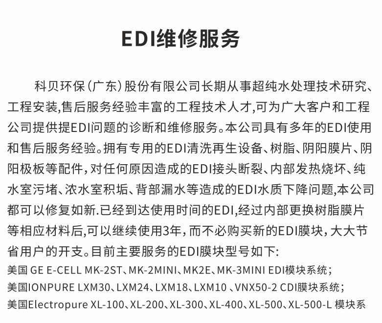 科贝环保长期从事超纯水处理技术研究、工程安装,售后服务经验丰富的工程技术人才,可为广大客户和工程公司提供提EDI问题的诊断和维修服务。本公司具有多年的EDI使用和售后服务经验